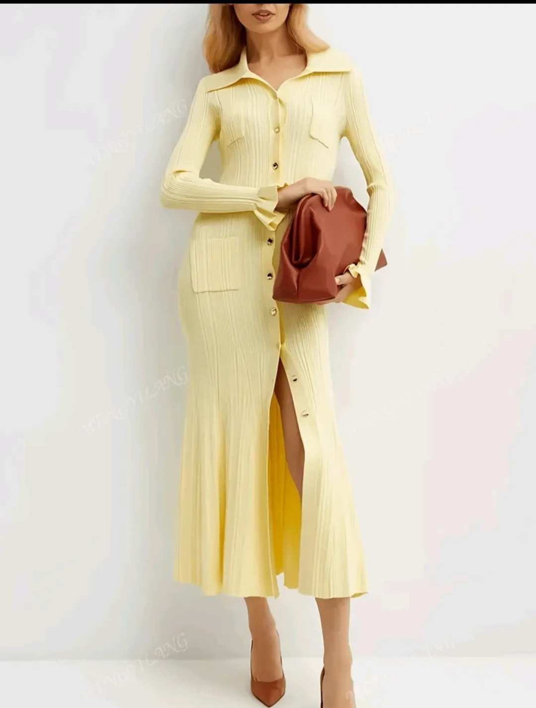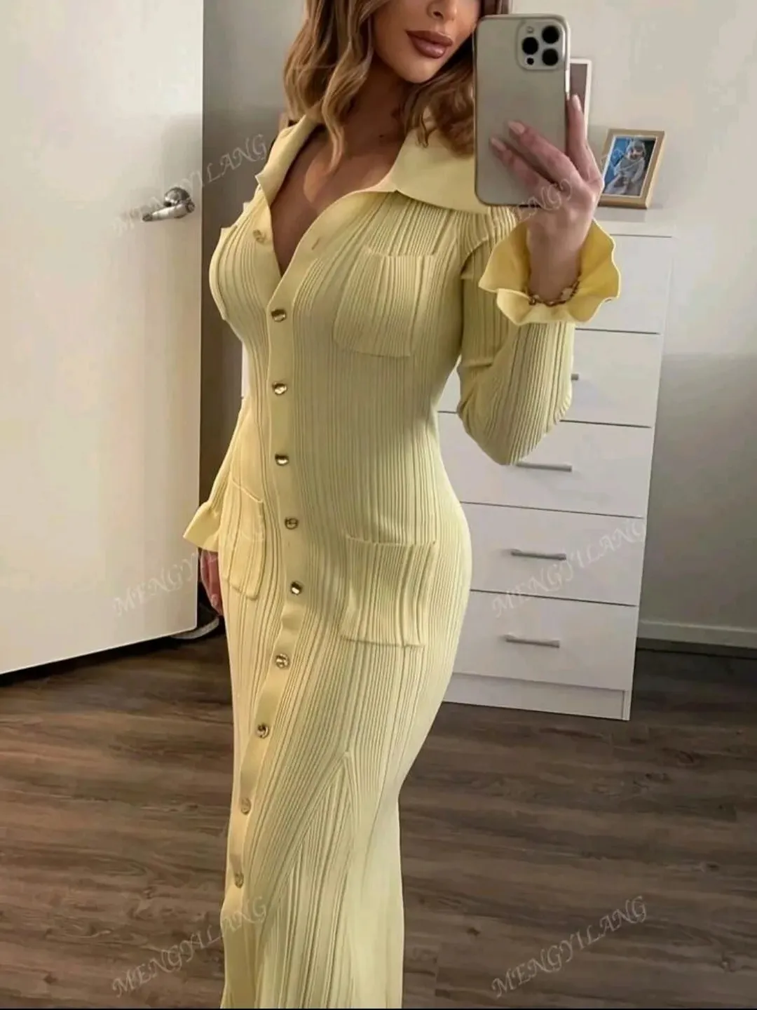 Women's New Elegant Commuting Knit Dress, Fashionable Long Knit Dress, Daily Slim-Fit, Solid Color Versatile With Front Button Pockets, Cream-Yellow, Vintage-Look High-End, Ladies' Street Casual Wear, Autumn/Winter